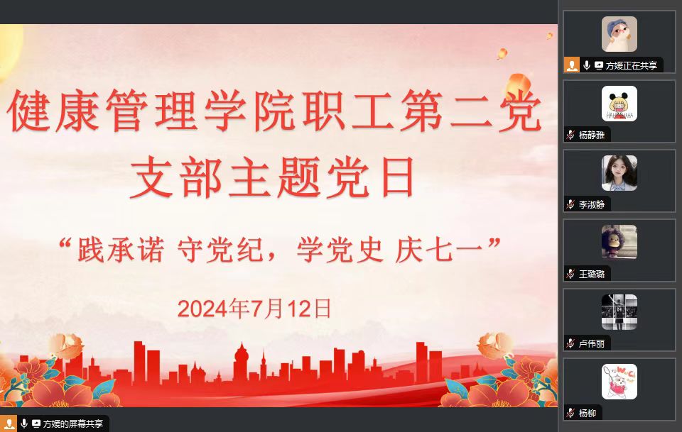 7月12日上午,新利Lucky官网党总支职工第二党支部在线上企业微信群开展7月份主题党日活动,主题围绕“践承诺 守党纪,学党史 庆七一”展开。会议由党支部书记方媛主持,全体党员及预备党员参加。