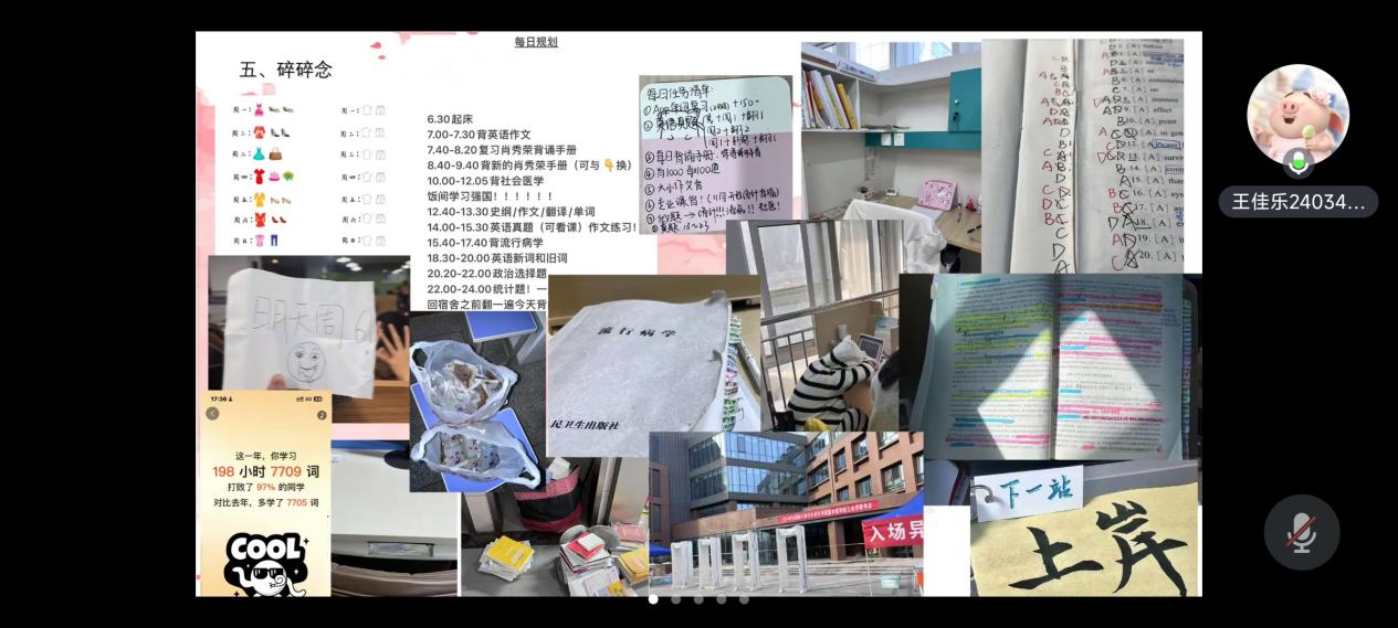 在会上,王佳乐同学结合自身备考经历,主要分享了初试备考心得。她提到:“选择大于努力,但努力是选择的底气。”在院校选择上,她建议同学们综合评估自身实力、地区偏好与历年分数线;在备考过程中,她提醒大家“单词是英语的生命线”,推荐“前期书本+后期APP”的滚动记忆法,并提醒政治复习需“以选择题提分为核心,大题紧跟权威押题”。