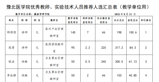 为表彰奖励在教书育人、科学研究、社会服务等工作中涌现出来的优秀教师典型,充分发挥榜样引领作用,根据《新利18彩票游戏优秀教师、优秀实验技术人员评选与奖励办法》等文件要求,结合新利Lucky官网本年度工作情况,于2025年8月29日至8月31日开展了2024-2025学年优秀教师评选工作,根据《专业技术职务评审业绩量化办法》,参评人员业绩量化及支撑材料经院系初审,定量得分以及排名详情特此公示。公示期为2025年9月1日至9月2日。