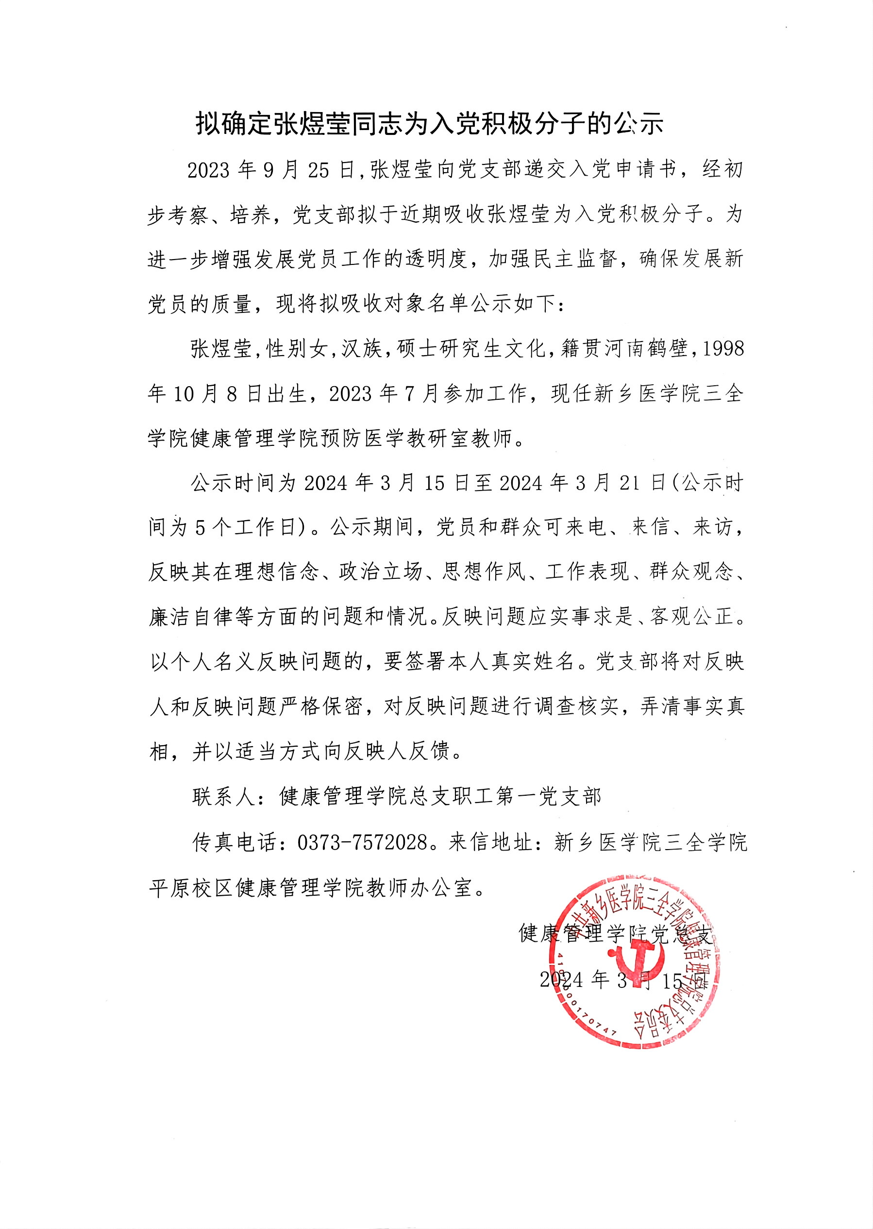 拟确定张煜莹、胡雪寒同志为入党积极分子的公示