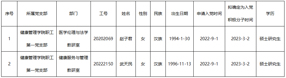 根据个人实际表现和党支部培养教育考察情况,经各党支部推荐,护理学院党总支审核,确定赵子君、武天民两位同志为入党积极分子。按照学院党委有关发展党员工作的制度规定,现对两位同志的基本情况予以公示...